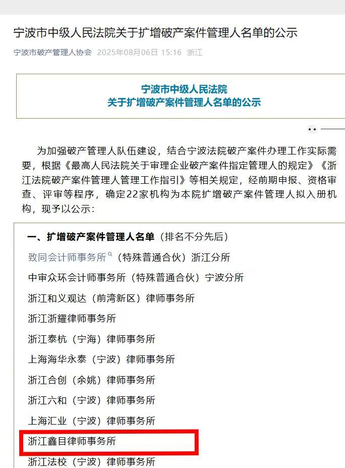 近日,宁波法院破产案件办理工作实际需要,根据《最高人民法院关于审理企业破产案件指定管理人的规定》《浙江法院破产案件管理人管理工作指引》等相关规定,经前期申报、资格审查、评审等程序,对企业破产案件管理人名册进行了更新。浙江鑫目律师事务所成功入选宁波市中级人法